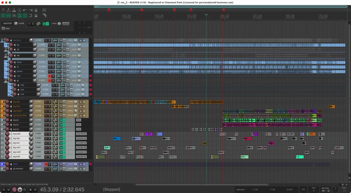 중요한 것은 생각보다 다양하게 트랙을 나눠서 녹음하는 것이 더 입체적인 소리를 만든다는 것인데요. swell 주법도 한 트랙에서 이어지는 것보다, 두 트랙에서 주고받으면서 녹음하면 믹스했을 때 입체감도 커지고 듣기도 좋습니다.